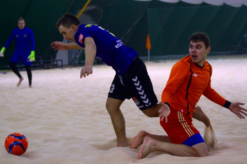 Следующими на песок вышли «озолоченные газетчики» и подопечные Бутомо. Первые пять минут матча «Коломяги» полностью подавили соперника, устроив настоящие «ковровые бомбардировки» ворот «синих», место в которых занял Вадим Багринец, в эти минуты совершивший не одно невероятное спасение, но и он был бессилен после прицельного удара Драгуна в концовке периода.